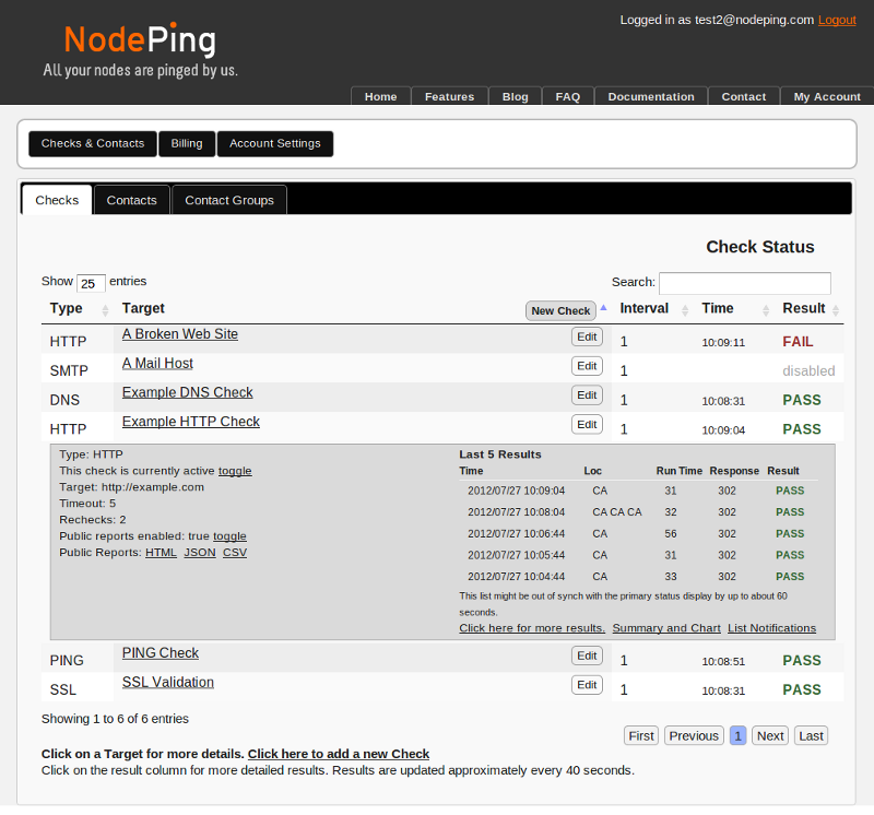 NodePing provides website and server availability monitoring. At its most basic, the service lets users enter a list of addresses of web site addresses or other Internet based services, and then checks to see if that site or service is responding properly. If a web site or other service does not respond correctly, the service automatically notifies someone by email or SMS. Results are stored in our databases so they're available for reports. Using the service for basic web site monitoring is very easy, and only takes a few minutes to set up and get your first results. Then the goal is to make it take as little attention from you as possible, so you can mostly ignore it unless something needs attention. After all, that's a big part of what server monitoring is for. The service is designed to be very easy to use, and to make it very easy to get the information you need about your sites and systems. If you are just getting started, we suggest you go to our Getting Started page and jump right in.