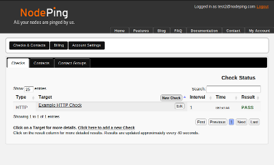 NodePing is designed to be as easy to use as possible without sacrificing on the capabilities you need. You can get quick results by just setting up some checks and watch the results start coming in. Each check causes the service to connect to some web site or service on the Internet and report on whether or not it was able to do so. So, getting started is as easy as clicking on "Click here to add a new Check," picking HTTP on the check type, entering a web site address in the URL field, and clicking "Save."
